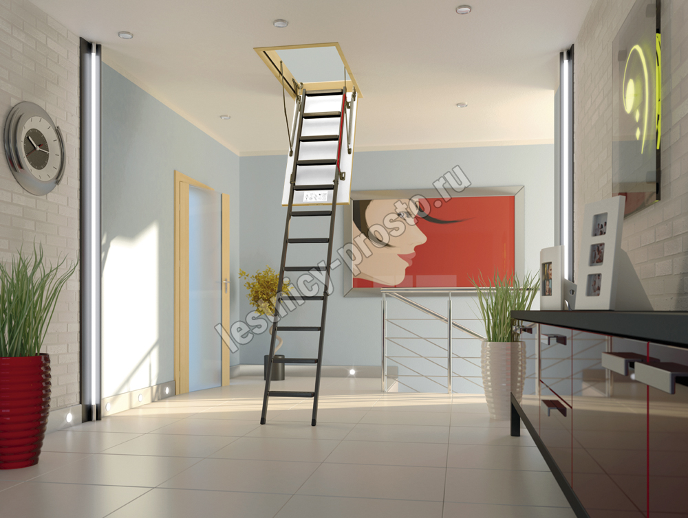 Герметичность всей конструкции достигается благодаря утеплению крышки люка и контурному уплотнению по периметру, что предотвращает возможные теплопотери. Чердачную лестницу очень легко разложить и сложить благодаря наличию специального стержня с четырехугольной насадкой. Установленные в лестнице угловые петли-шарниры нового образца придают ей высокую прочность и надежность, а также предохраняют короб от возможной деформации. Основное преимущество чердачной складной металлической лестницы LMK сводится к ее небольшим габаритам при сохранении высокой функциональности, прочности, надежности и эстетичности конструкции. Монтировать лестницу очень просто, для этого не придется затрачивать много времени и сил. Применение лестничной конструкции этого типа позволяет существенно экономить пространство. Монтажный комплект LXK в комплекте не поставляется.