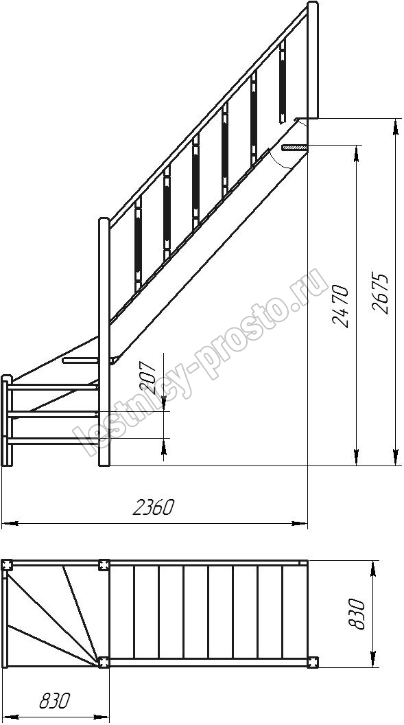 Деревянная межэтажная лестница ЛЕС-07 2470-2675 проем 2360-830, Бук