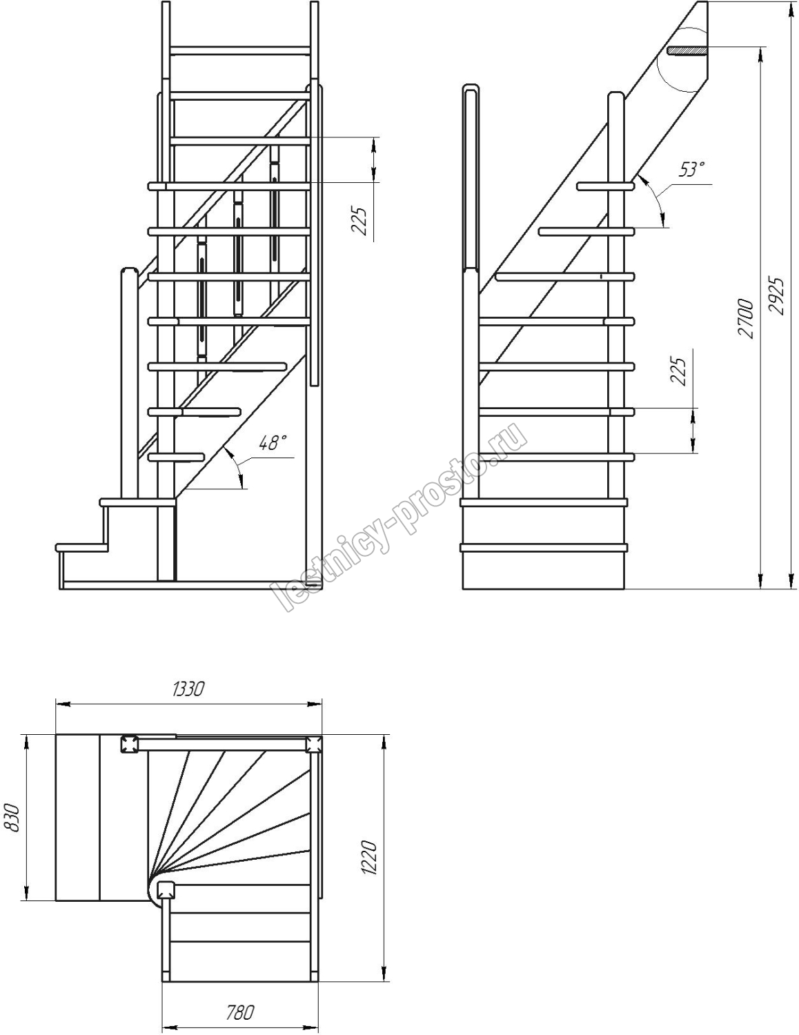 Деревянная межэтажная лестница ЛЕС-91 2700-2925 проем 1220-780, Лиственница