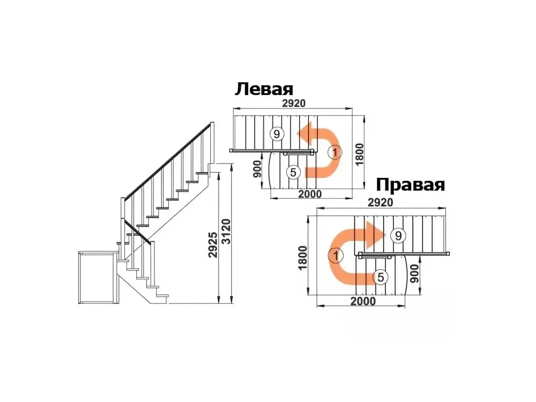 Материал: Дуб (ступени и поручень), сосна (косоуры, столбы, балясины)