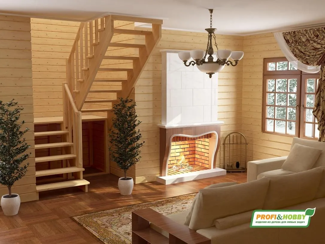 Ступени и поручень лестницы изготовлены из дуба, остальные элементы из сосны. Возможно изготовление данной модели полностью из дуба. Базовый комплект включает в себя деревянные элементы лестницы и ограждения без какого-либо покрытия.