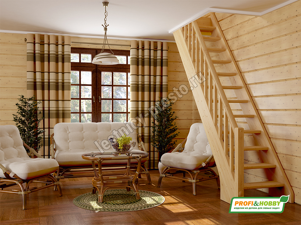 Ступени и поручень лестницы изготовлены из дуба, остальные элементы из сосны.