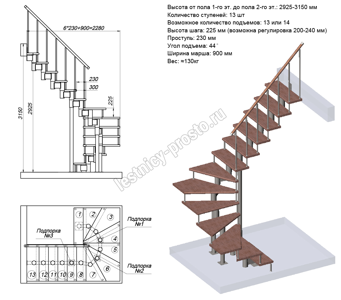 Схема и расчет указаны для шага 225 мм - мы рекомендуем эту высоту шага, как оптимальную для комфортного подъёма и экономии бюджета.