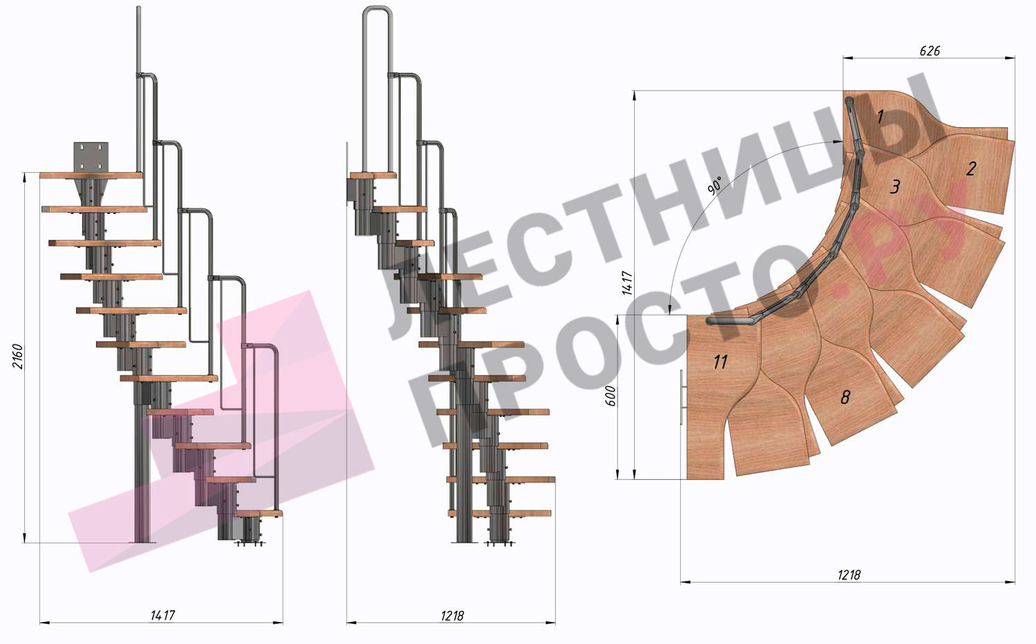 | Лестница Prosto Urban Grey г-образная гусиный шаг 600 мм, h216-312 см (12 ступеней) |