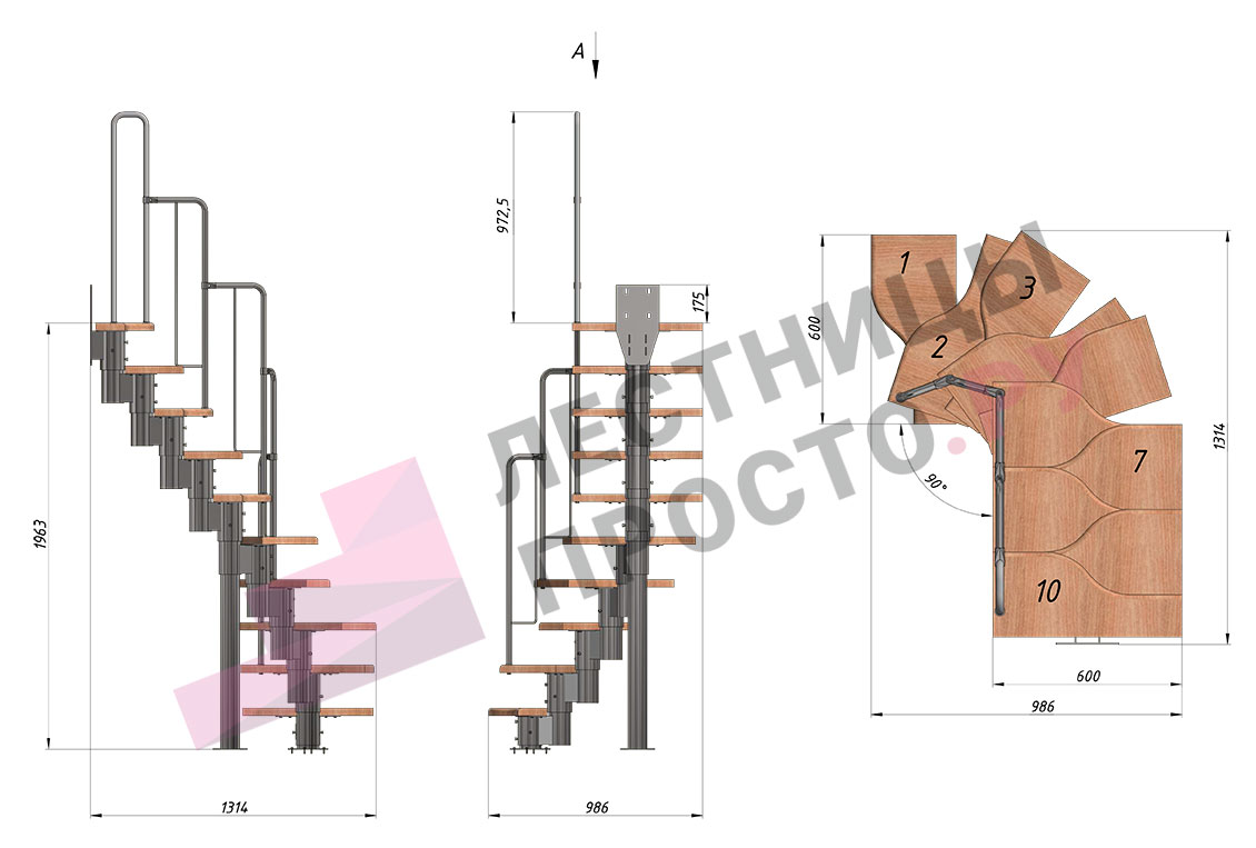 | Лестница Prosto Urban Grey г-образная гусиный шаг 600 мм, h180-264 см (10 ступеней) |